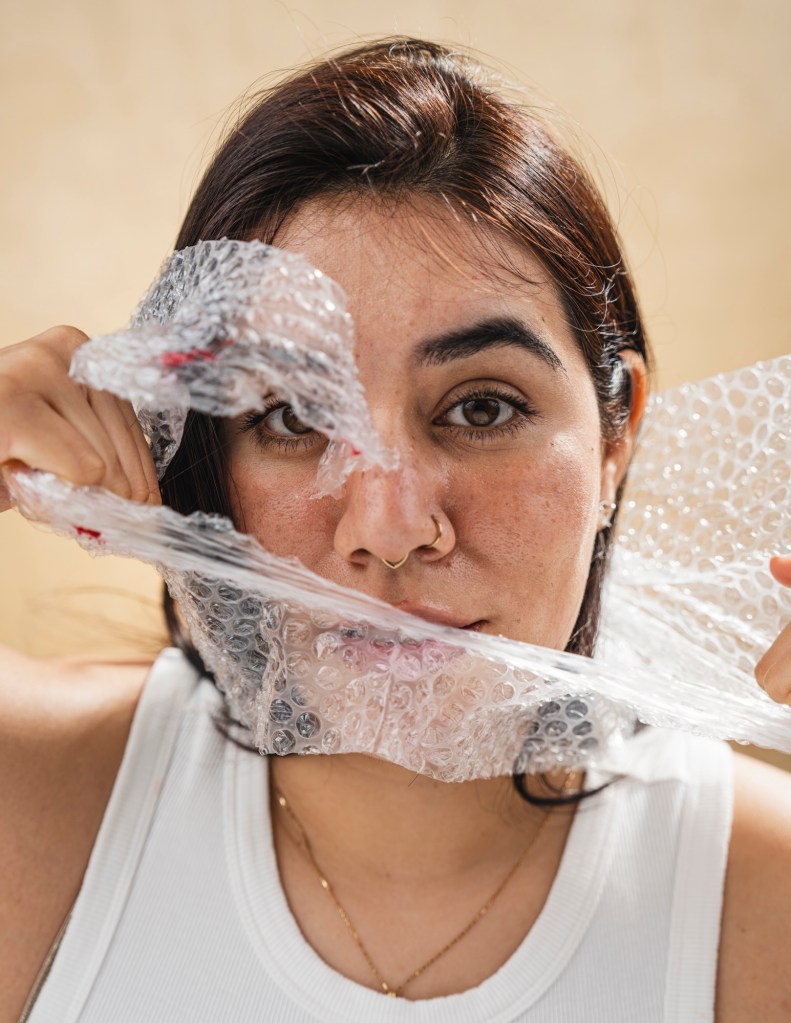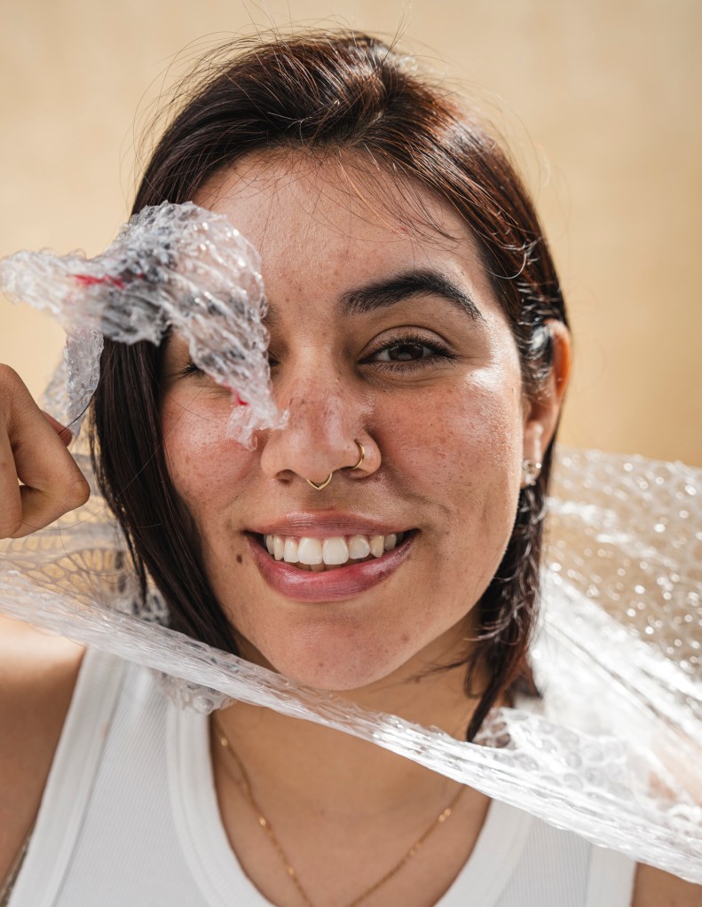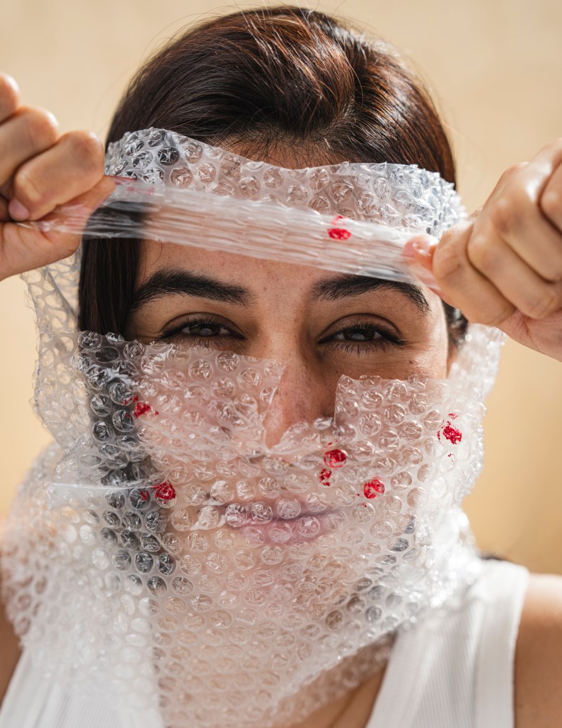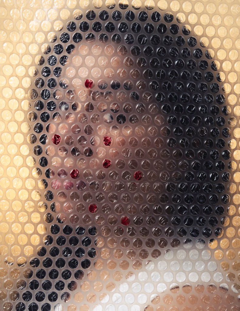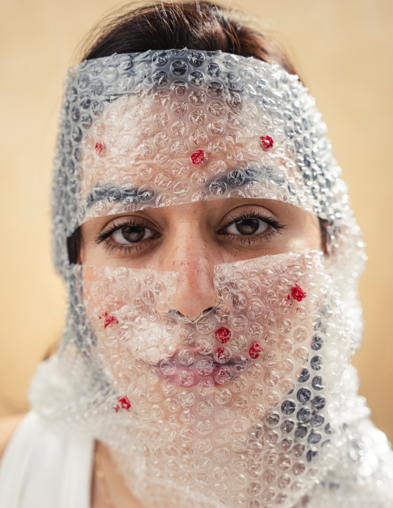 The concept being approached was to literalize the intangible, in this case fighting internal and external struggles of cystic acne. While modern beauty photography is meant to be portrayed bright and airy while highlighting the typical “flawless woman”, it does not consider how unrealistic this expectation really is. Even the photos taken for these ads include massive amounts of makeup, and even then it finishes with advanced levels of retouching. This led me to realize there have been many satirical reinventions making fun of these unrealistic archetypes. Therefore I wanted to dig into giving an outlet to express the true pressure of bad skin, and feeling like it’s the first if not the only thing people see about you. Considering my specialty revolves around headshots and tight studio portraits I found it easy to create a beauty setup while adding my own flare. I adhered to the bright airy feel and even was able to pitch the treatment to a cosmetologist also attending FIT who was on board to collaborate. Ultimately, I decided to use bubble wrap to represent the pimples and cysts, to recreate the feeling of being blurred by the imperfections, I draped the bubble wrap in front of the subject’s face, distorting her features. With some bubbles being painted red, it gave an uncanny valley effect where you can see the person, but are blinded by what sits in front of them. The climax of the shoot, reaching rock bottom, feeling suffocated by your acne. However, like all things, there is a silver lining, to find a product that empowers you to overcome the self battle.